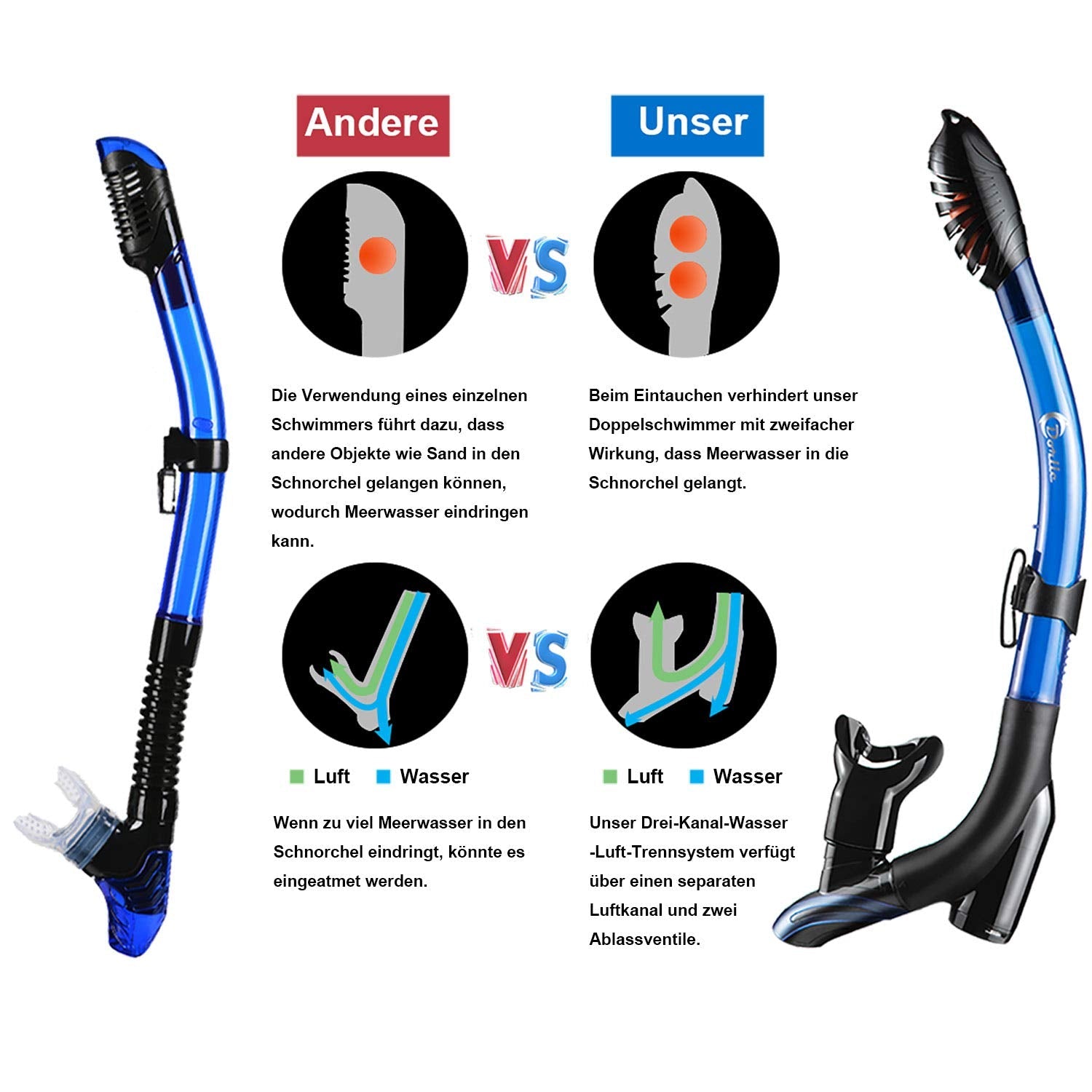 - ★Geruchloses Silikon in Lebensmittelqualität: Die Taucherbrille und der Schnorchel bestehen aus geruchsneutralem Silikonmaterial in Lebensmittelqualität. Das Mundstück ist auch noch nach längerer Zeit bequem. Der Brillenrand aus Silikon ist langlebig und die Ränder liegen nahe am Gesicht, und sind somit wasserdicht. Die Schnorchel-Set ist die beste Wahl für Taucher, Schnorchler, Freizeittaucher, Fotografen und Abenteurer.