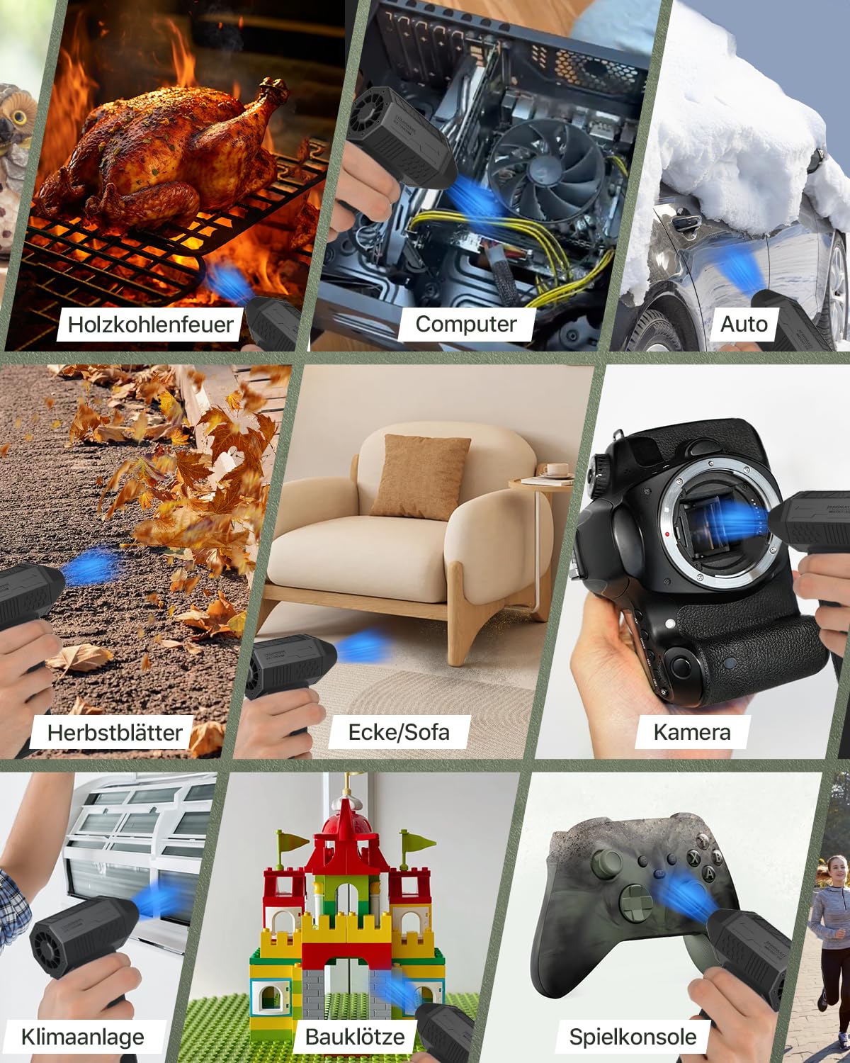 - ✅MINI & COOLES DESIGN —— Der dust blower druckluft hat die Größe eines Telefons, ist leicht und tragbar, perfekt für Outdoor-Camping und das Entfernen von Blättern im Garten. Elektrische Staubgebläse hergestellt aus ABS-Materialien mit hoher Härte und Temperaturbeständigkeit, bietet er einen rutschfesten Griff und eine starke Abdichtung. Sein schlankes Design erleichtert die Aufbewahrung und sieht stylisch aus. Auch als Dekoration im Haus macht er eine gute Figur.